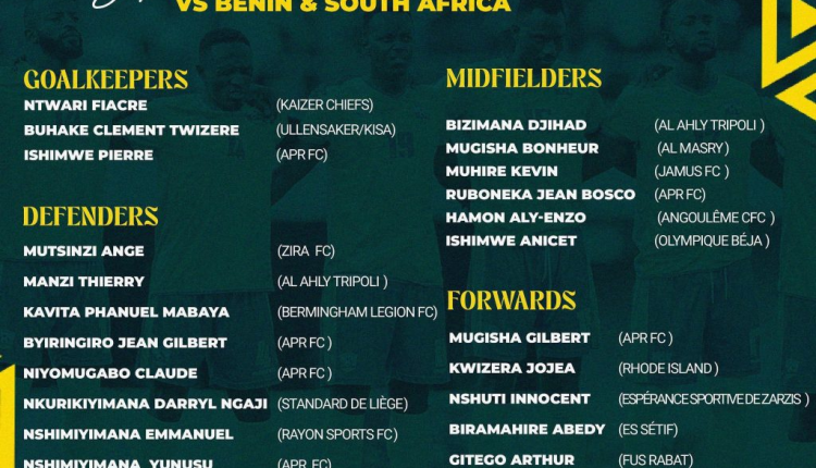 Aba ni abakinnyi bazakina umukino wa Benin uteganyijwe tariki ya 10 Ukwakira kuri Stade Amahoro, mbere yo gusoza iyi mikino rusura Afurika y’Epfo ku wa 14 Ukwakira 2025.