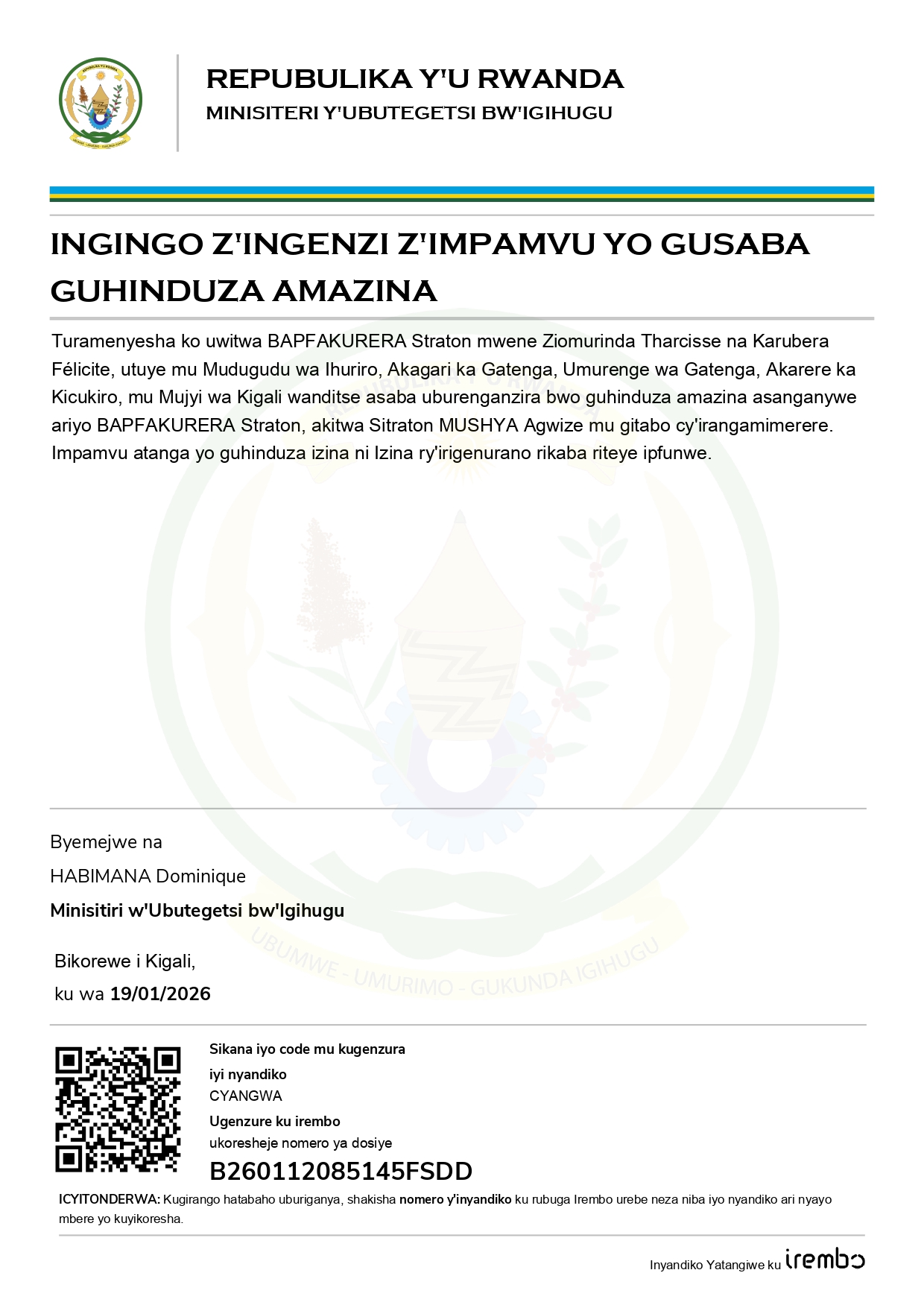 Uwitwa BAPFAKURERA Straton mwene Ziomurinda Tharcisse na Karubera Felicite utuye mu mudugudu wa Ihuriro, Akagari ka Gatenga, umurenge wa Gatenga, akarere ka Kicukiro ho mu mujyi wa Kigali, yanditse asaba uburenganzira bwo guhinduza amazina yari asanganywe ariyo BAPFAKURERA Straton agasimbuzwa Sitraton MUSHYA Agwize mu gitabo cy’irangamimerere. Impamvu atanga zishimangira ubusabe bwe, ni uko izina yari asanganywe ari irigenurano kandi riteye ipfunwe.