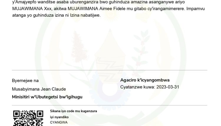 Uwitwa Mujawimana Xxx mwene Rwambuga na Kankindi, utuye mu Ntara y’Amajyepfo, Akarere ka Kamonyi, umurenge wa Mugina, mu kagari ka Mbati, umudugudu wa Kigorora, yanditse asaba uburenganzira bwo guindura amazina yari asanzwe akoresha ariyo MUJAWIMANA Xxx. agasimbuzwa MUJAWIMANA AIMEE FIDELE, aya akaba ariyo yandikwa mu gitabo cy’irangamimerere.