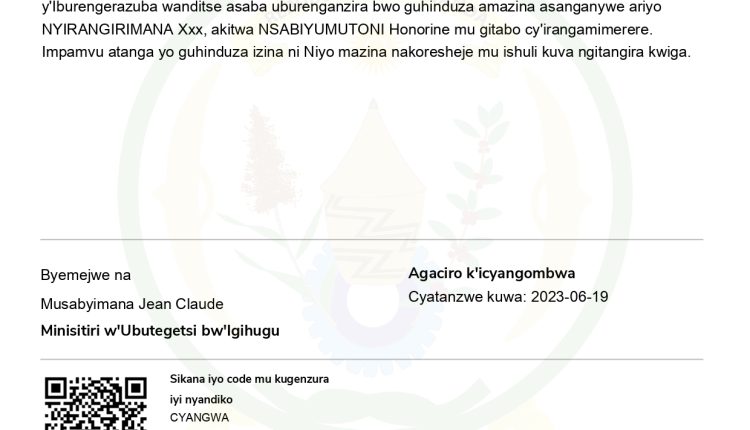 Uwitwa Nyirangirimana Xxx mwene Nyandwi na Nyiranzayino utuye mu Ntara y’Ibuburengerazuba, Akarere ka Rutsiro, Umurenge wa Kivumu, Akagali ka Nganzo ho mu mudugudu wa Nyabiti, yanditse asaba uburenganzira bwo guhindurirwa amazina yari asanzwe akoresha ariyo NYIRANGIRIMANA Xxx agasimbuzwa NSABIYUMUTONI Honorine, akaba ari nayo yandikwa mu gitabo cy’irangamimerere.